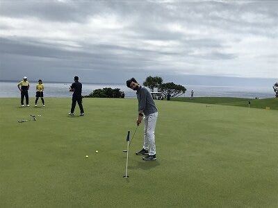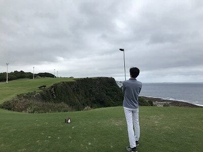 海を背景にパッティングするイケメン雨男