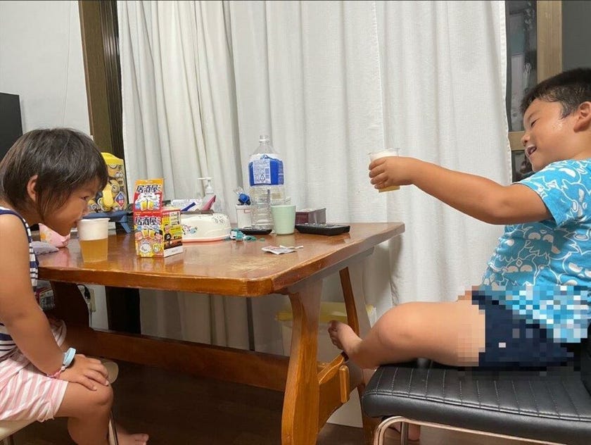 駄菓子「居酒屋ごっこ」に入っていた”こどもビール”を片手に、スゴイ美味しそうな顔してる!!ww