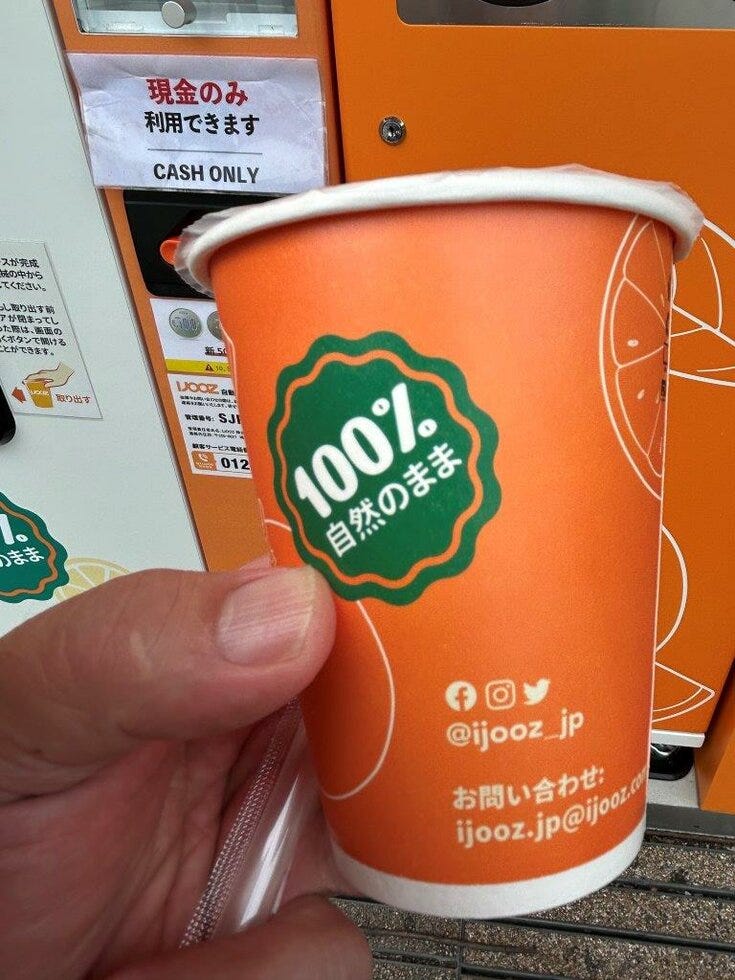 結構TVとかで話題になっていた生絞りオレンジジュースの自販機です。