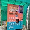 皆さんこんにちは、土居です! 最近衣笠商店街に面白いものができたので、つい写真を撮って来ちゃいました! それがこれ!「FLESH 100% ORANGE(生絞り果汁10...